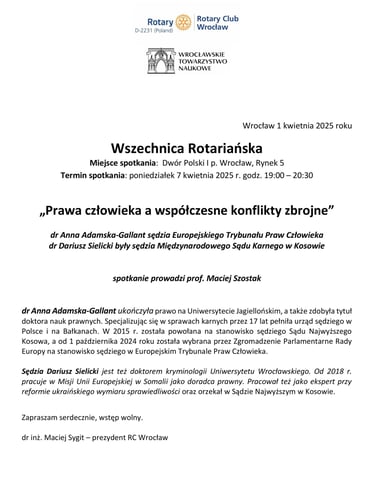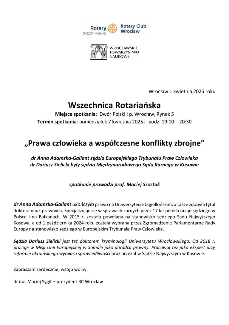 7 kwietnia 2025 roku w Dworze Polskim we Wrocławiu odbędzie się spotkanie Wszechnicy Rotariańskiej zatytułowane „Prawa człowieka a współczesne konflikty zbrojne”. Wydarzenie, zaplanowane na godzinę 19:00, zgromadzi wybitnych ekspertów w dziedzinie prawa międzynarodowego i praw człowieka. Prelegentami będą dr Anna Adamska-Gallant, sędzia Europejskiego Trybunału Praw Człowieka, oraz dr Dariusz Sielicki, były sędzia Międzynarodowego Sądu Karnego w Kosowie. Spotkanie poprowadzi prof. dr hab. Maciej Szostak