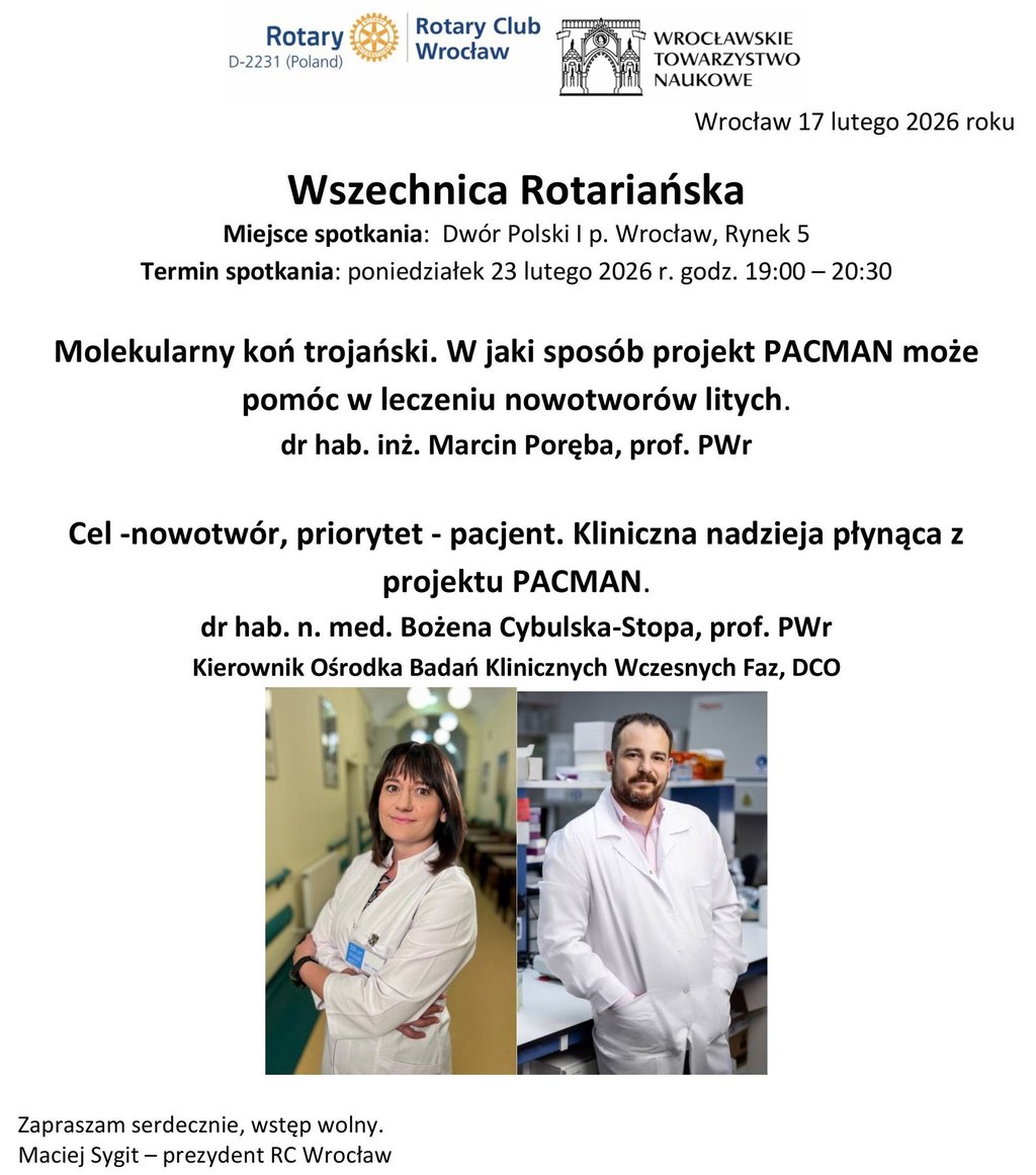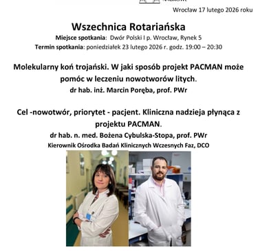 Z przyjemnością zapraszamy na spotkanie w ramach Wszechnicy Rotariańskiej, które odbędzie się w dniu 23 lutego 2026 roku o godzinie 19:00. Tym razem naszymi gośćmi będą wybitni eksperci: dr hab. inż. Marcin Poręba oraz dr hab. n. med. Bożena Cybulska-Stopa, oboje z Politechniki Wrocławskiej. Prelekcja będzie koncentrować się na innowacyjnym temacie, jakim jest molekularny koń trojański oraz jego rola w leczeniu nowotworów litych.