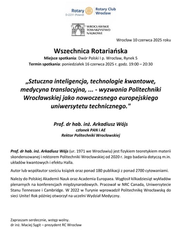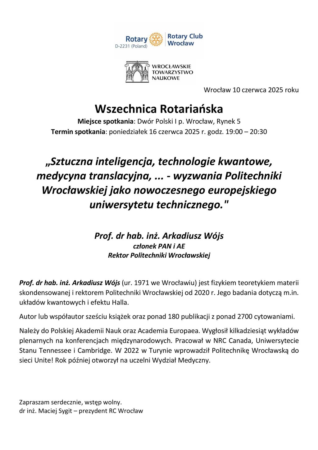 "Sztuczna inteligencja, technologie kwantowe, medycyna translacyjna, ... - wyzwania Politechniki Wrocławskiej jako nowoczesnego europejskiego uniwersytetu technicznego". Prof. dr hab. inż. Arkadiusz Wójs. 2025.06.16