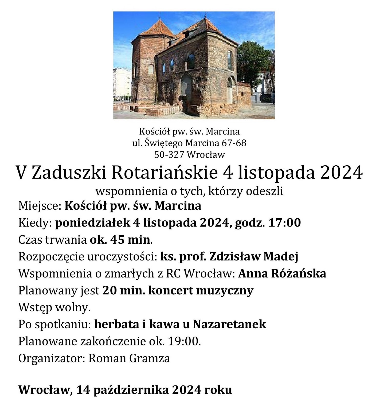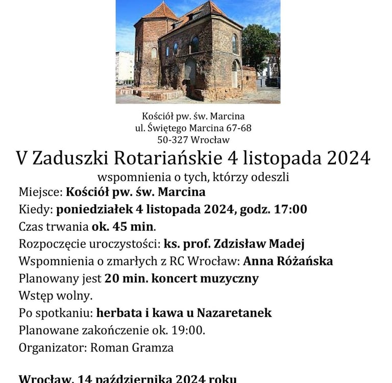 Zaduszki rotariańskie to wyjątkowe wydarzenie, które jednoczy członków Rotary i ich bliskich w refleksji nad życiem oraz przyjacielską pamięcią o tych, którzy odeszli. Dla wrocławskiego klubu Rotary, organizacja tego typu spotkania ma szczególne znaczenie. W tym roku, dnia 4 listopada 2024 roku, o godzinie 17:00, w kościele pw. św. Marcina we Wrocławiu odbywa się ta ważna ceremonia.