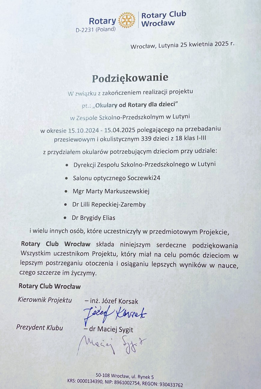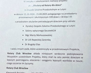 Z ogromną satysfakcją pragniemy poinformować o zakończeniu projektu "Okulary od Rotary" dla dzieci z Lutyni. Projekt ten, prowadzony przez Rotary Club Wrocław pod kierownictwem Józefa Korsaka, był wyjątkowym przedsięwzięciem, które miało na celu poprawę tej ważnej sfery życia najmłodszych.